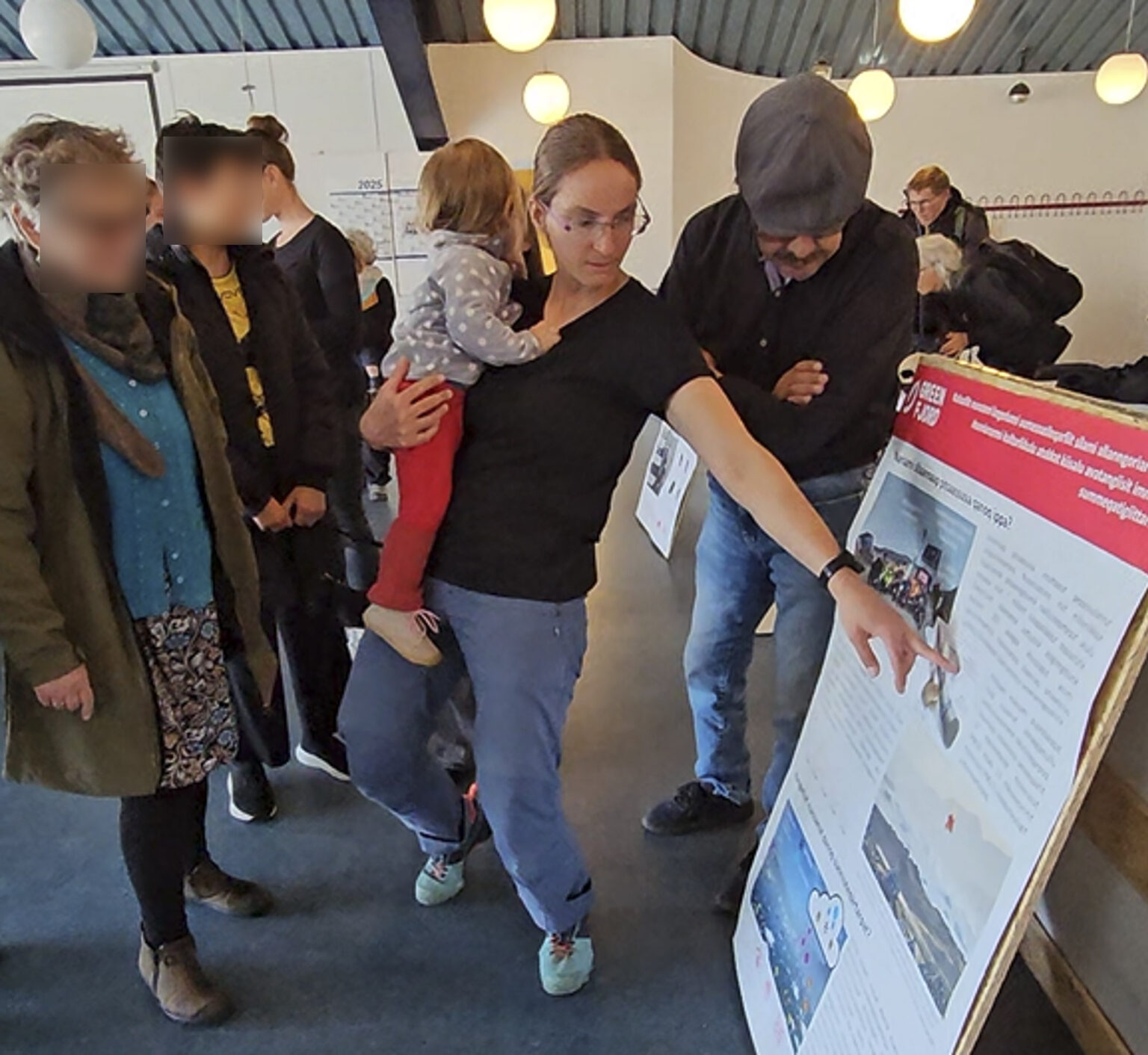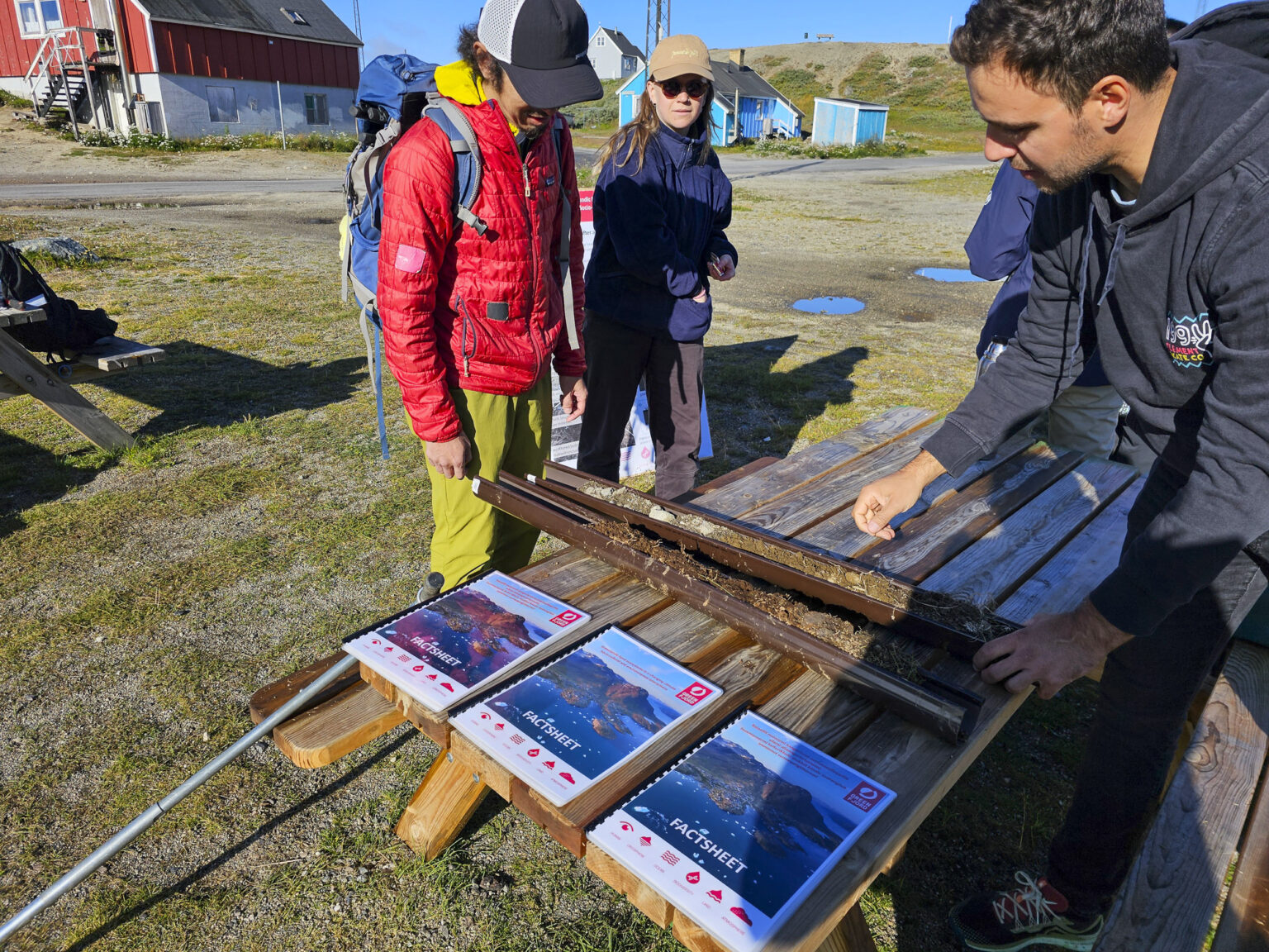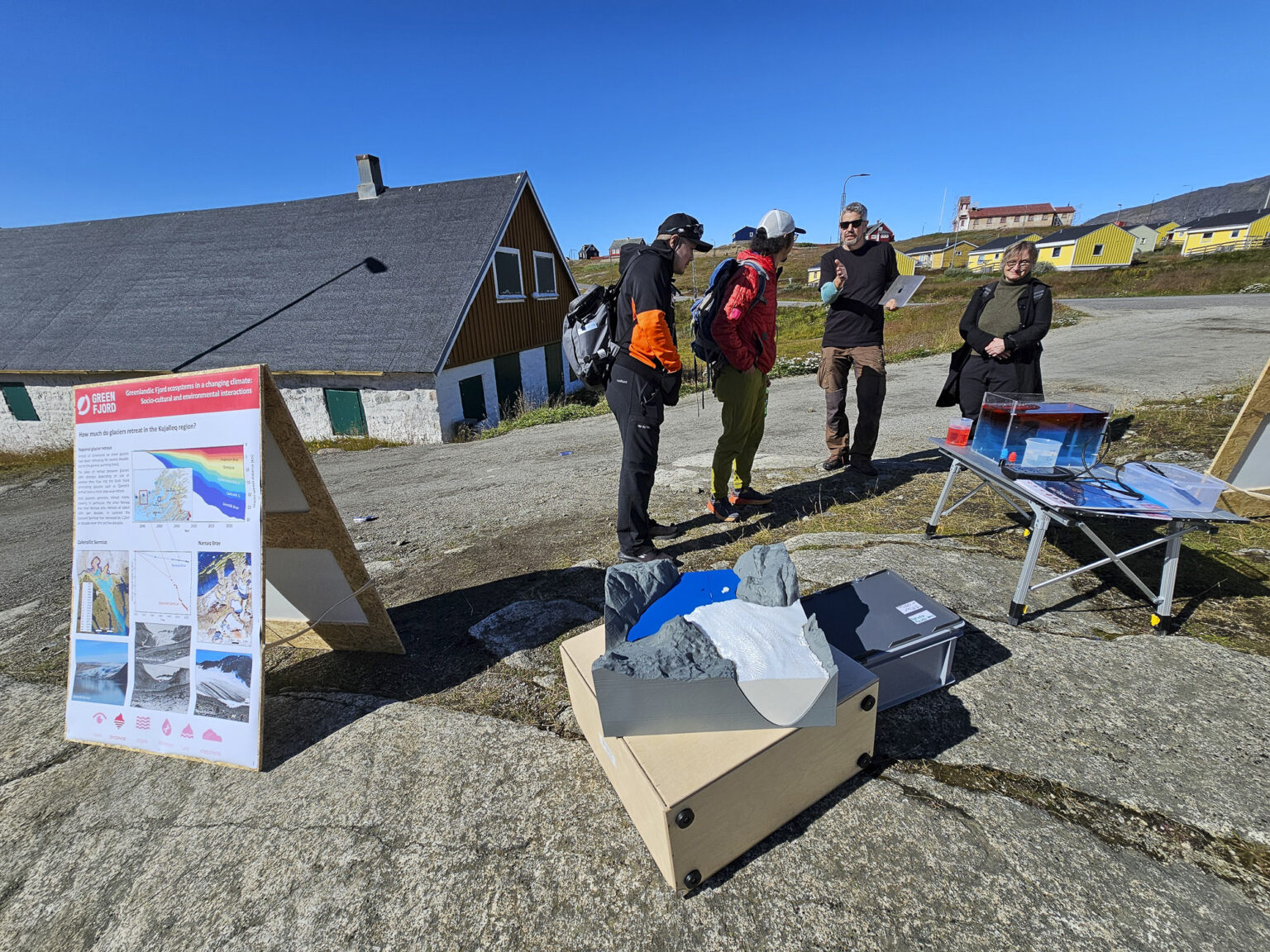 実は今回の出張では、大気観測と並行して、スイスの研究グループがグリーンランド南部の現地住民向けに実施していたアウトリーチを見学することも目的の一つでした。この研究グループは2022年からGreenFjordプロジェクト(代表者:Julia Schmale博士)を立ち上げ、ナルサークを含むグリーンランド南部でフィールド調査を行っています。多様な生態系が特徴的であるグリーンランド南部のフィヨルド環境が、気候変動によってどのような影響を受けているのかを理解するため、複数分野の研究を統合的に進めているプロジェクトです。プロジェクトの最終年度を迎えるにあたり、これまでの研究成果を現地住民に直接伝える場としてアウトリーチが行われました。その様子の一部を写真でお伝えしたいと思います