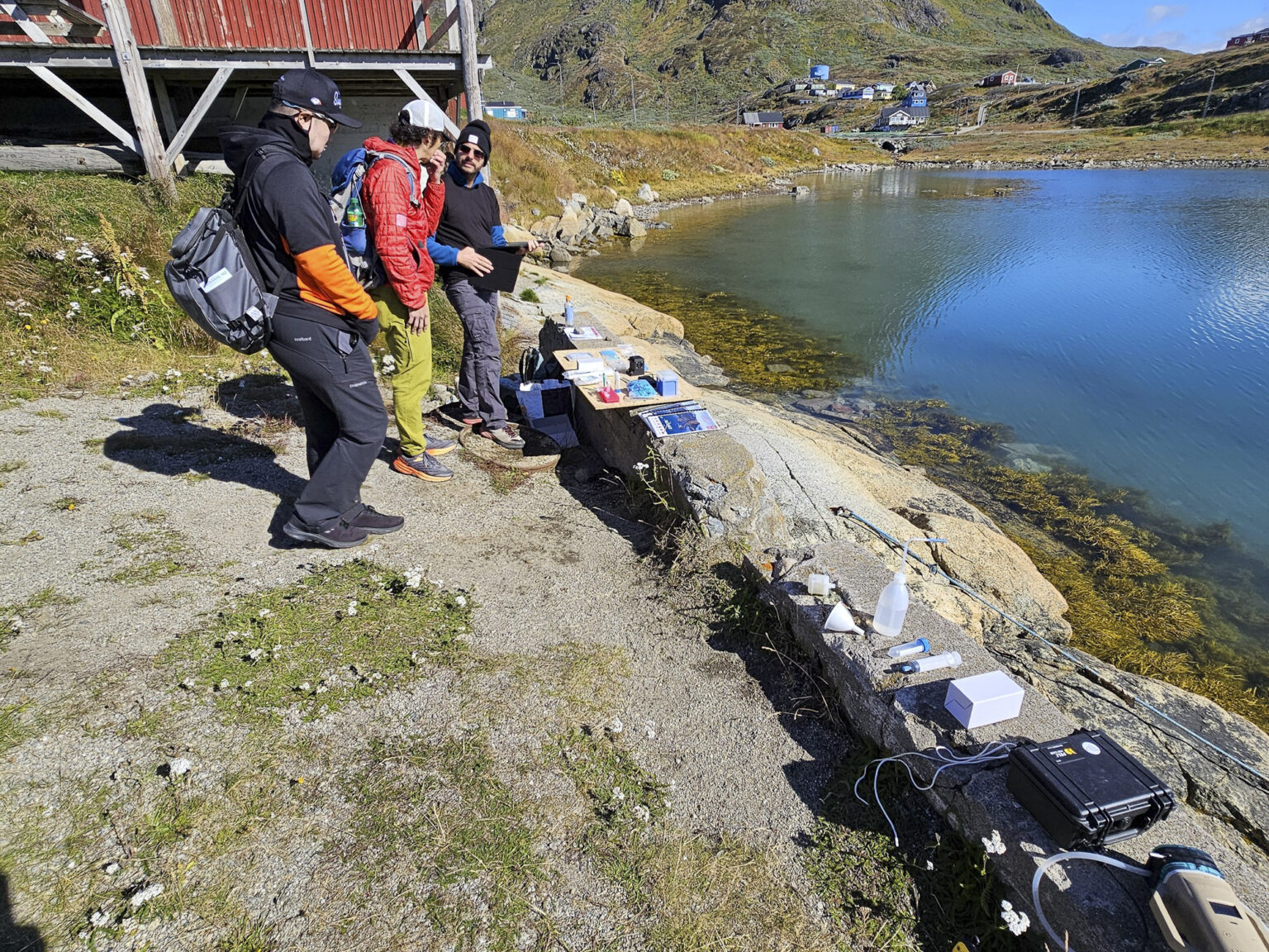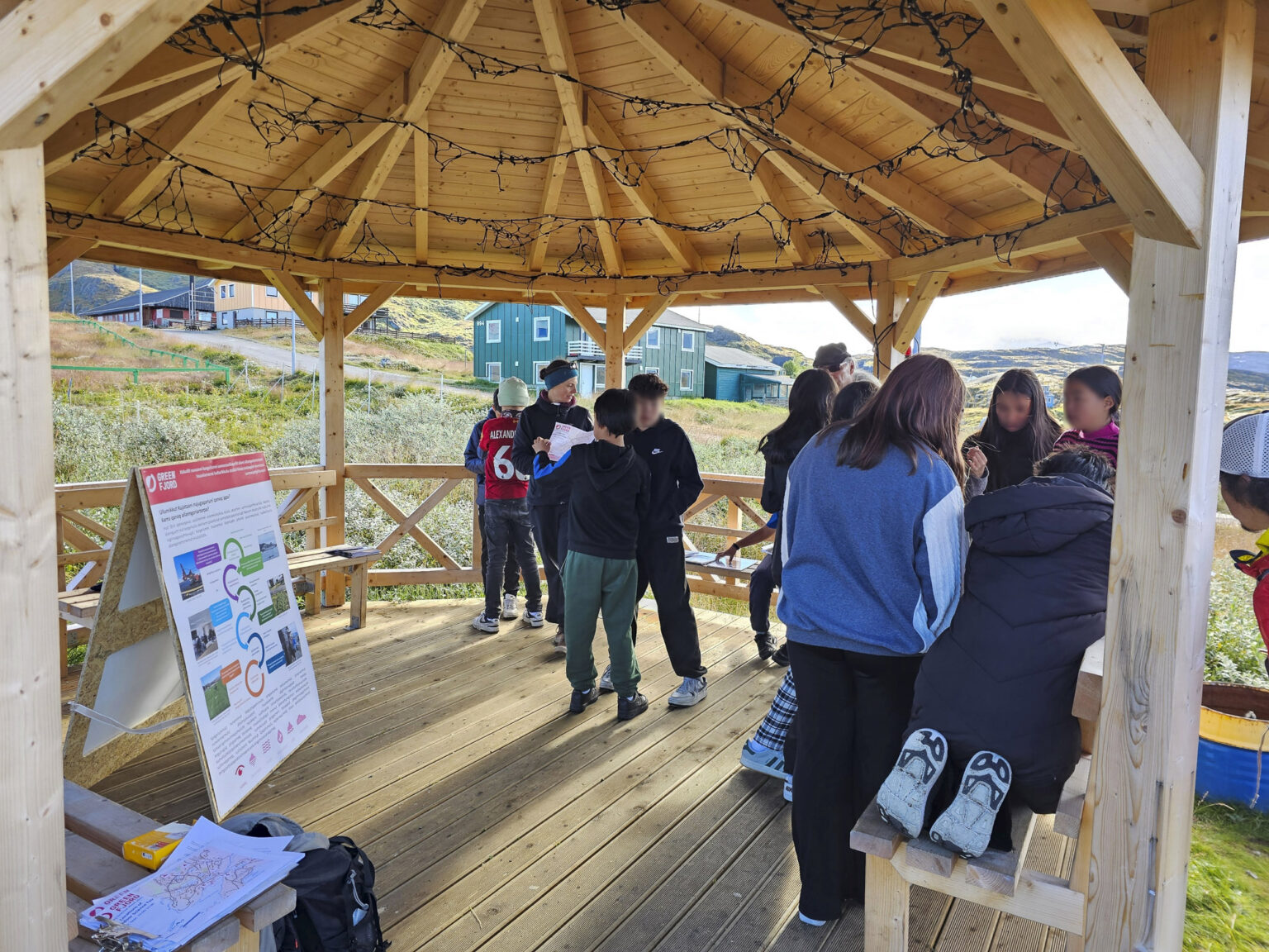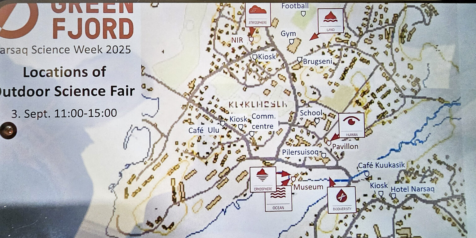 実は今回の出張では、大気観測と並行して、スイスの研究グループがグリーンランド南部の現地住民向けに実施していたアウトリーチを見学することも目的の一つでした。この研究グループは2022年からGreenFjordプロジェクト(代表者:Julia Schmale博士)を立ち上げ、ナルサークを含むグリーンランド南部でフィールド調査を行っています。多様な生態系が特徴的であるグリーンランド南部のフィヨルド環境が、気候変動によってどのような影響を受けているのかを理解するため、複数分野の研究を統合的に進めているプロジェクトです。プロジェクトの最終年度を迎えるにあたり、これまでの研究成果を現地住民に直接伝える場としてアウトリーチが行われました。その様子の一部を写真でお伝えしたいと思います