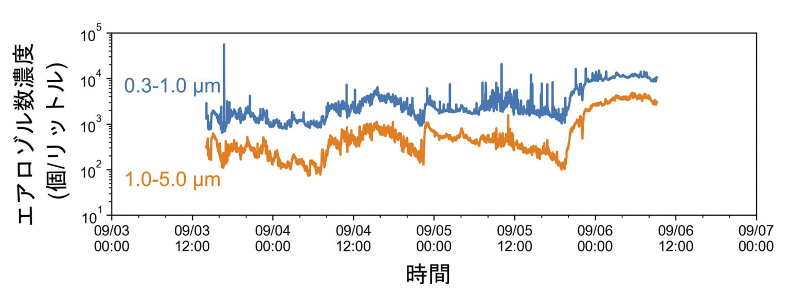 上の図をみればわかるようにエアロゾルの数濃度は様々な時間スケールで変動しています。気象条件、海洋の状態、生物活動など、多様な要因がこの時間変動を生み出していると考えられます。しかし、このデータだけでは、どのような発生源のどのような組成のエアロゾルがどれだけ存在していたのかを特定することはできません。