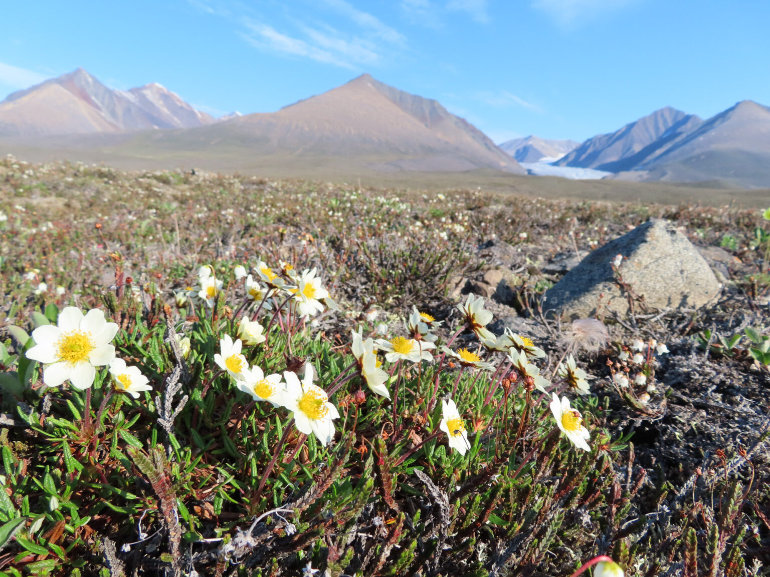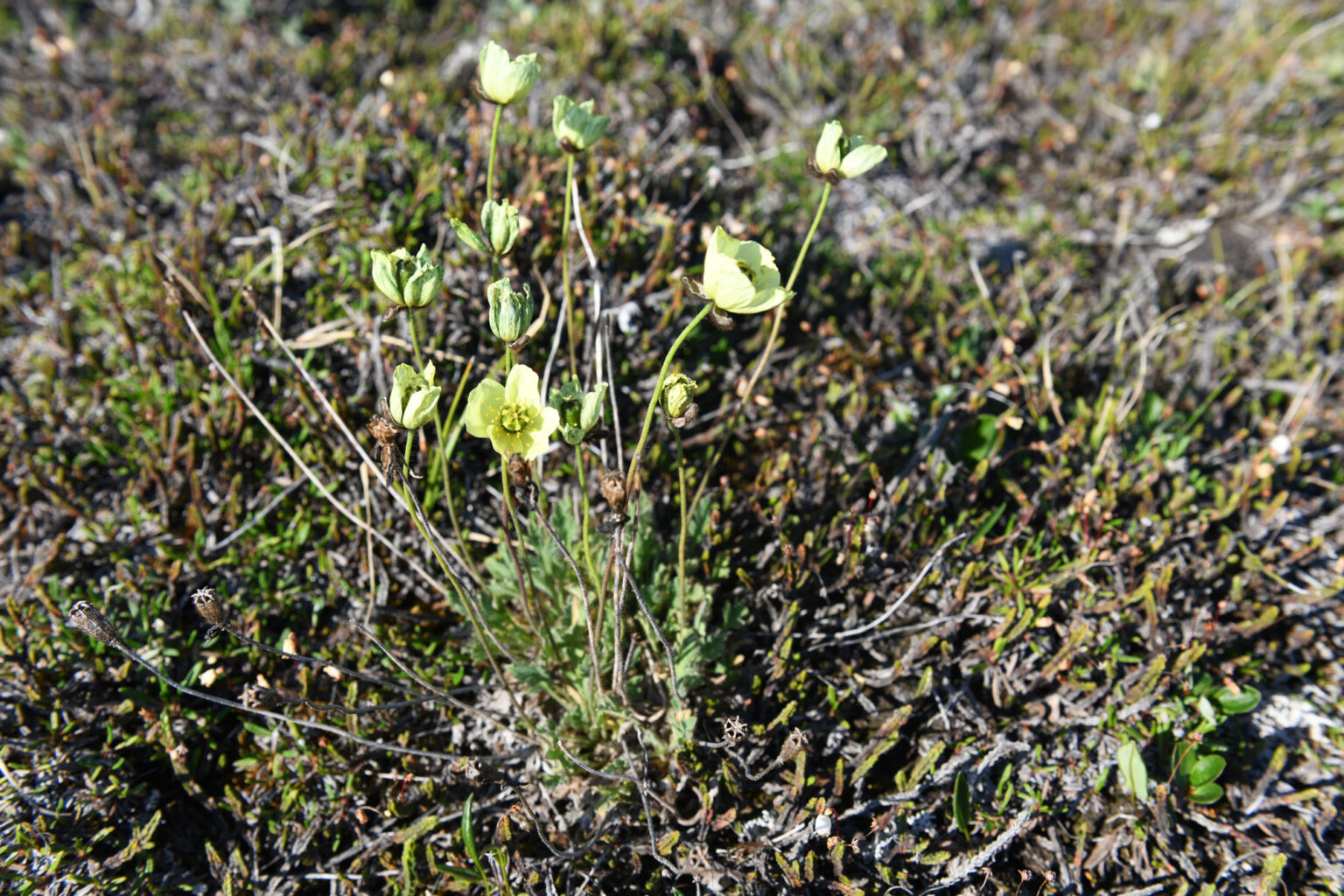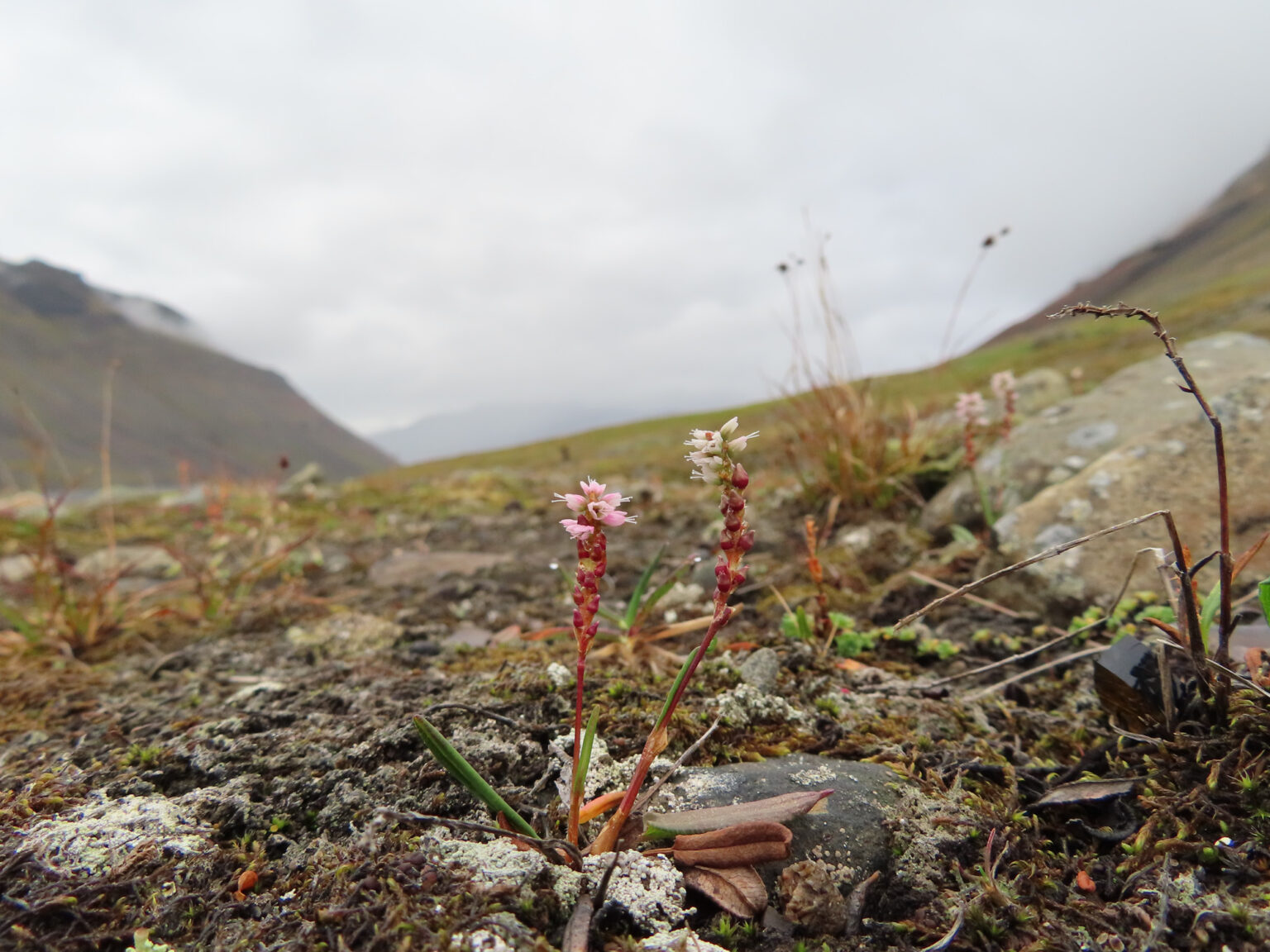 北極全体では2,200種ほどの植物が知られていますが、ニーオルスンの調査地ではおよそ20種が生息しています。植物には、一年のうちに発芽して、花をつけ、種を散布し、枯れるという生活史を送る一年生植物がいますが、北極だと寒い年が一回でもくれば種を作ることができずに死滅してしまうため、一年生植物はほとんどありません。複数年生き続けることができる多年生植物が多いです。また、夏の期間が短いため、種を作る前に寒くなってしまい、種が成熟できないことがあります。そのため、葉や茎の付け根などにムカゴと呼ばれる小さな球状のものを作ったり、脱落した個体の一部から再生したりするなど、種を作らなくても個体を増やすことのできる栄養繁殖をおこなう植物が多いです。