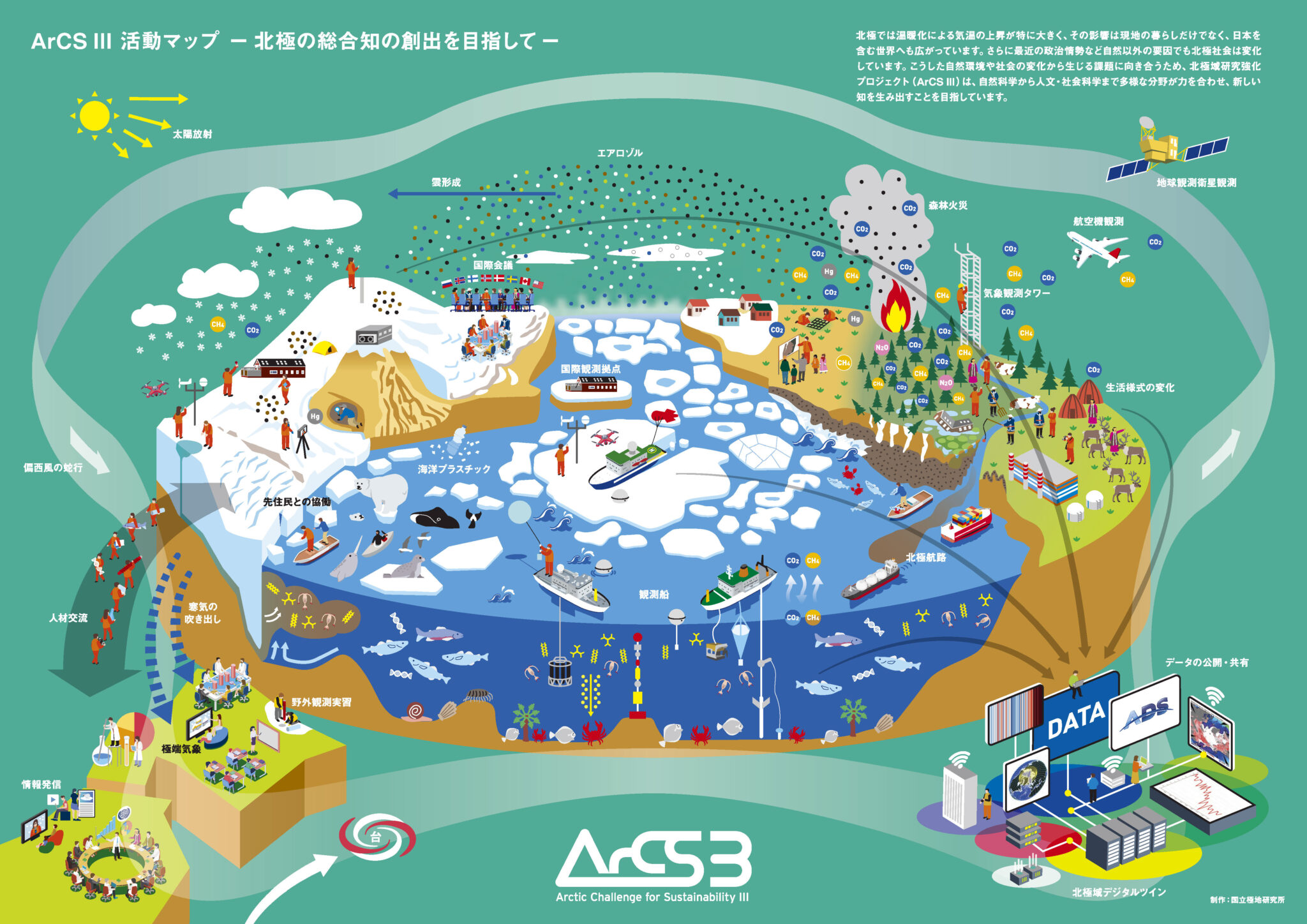 2025年に始動した北極域研究強化プロジェクト「ArCS III」の多岐にわたる活動を、一枚のグラフィックにまとめました。